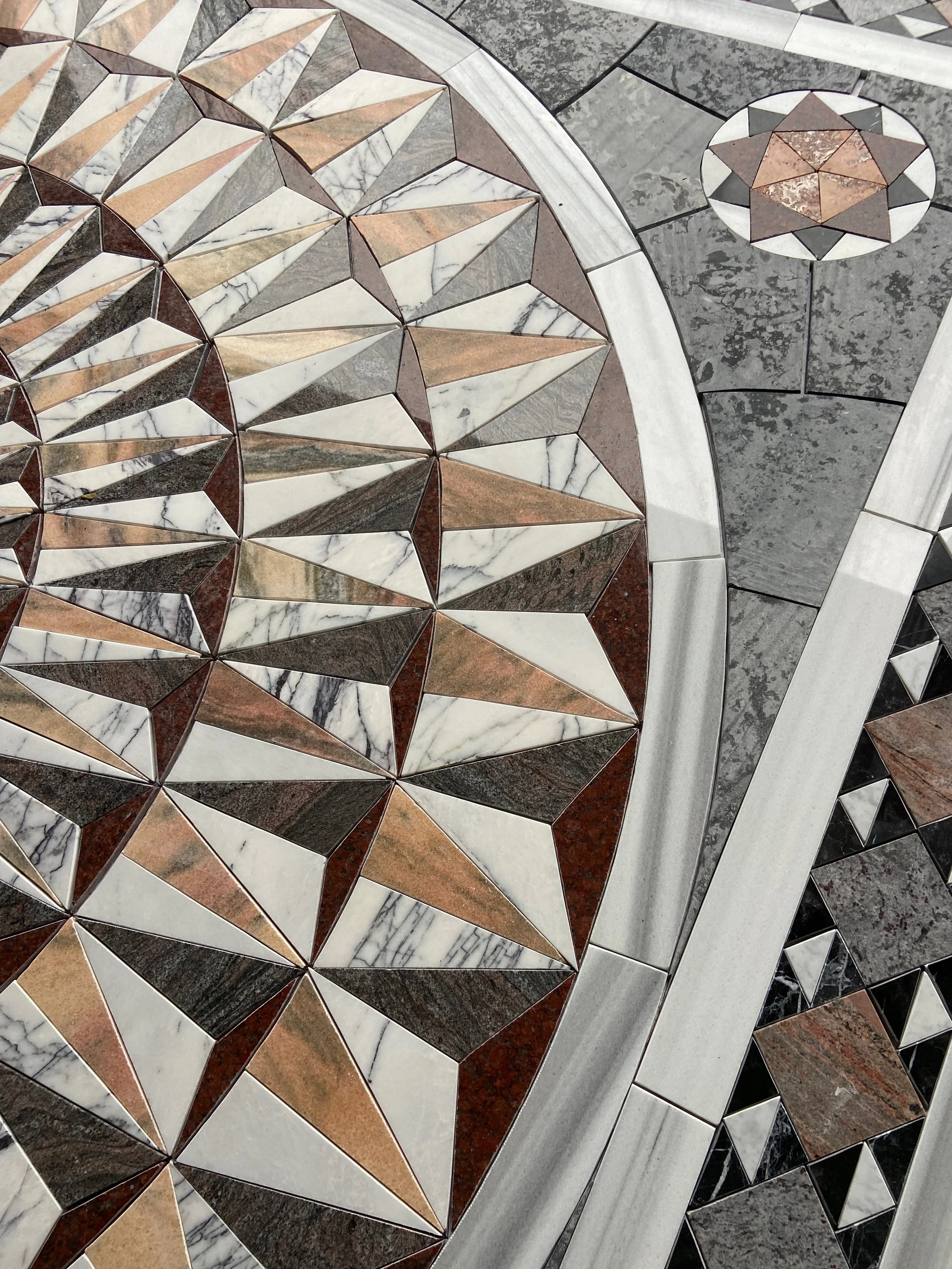 We build stone mosaics in a style known as opus sectile. Large pieces of stone are cut into specific shapes and patterns to create imagery. We use color, grain, and texture to paint with stone. Our mosaics are suitable for public institutions like schools, zoos, parks, and churches. A Hammerhead mosaic can make a compelling statement in a commercial space as well.